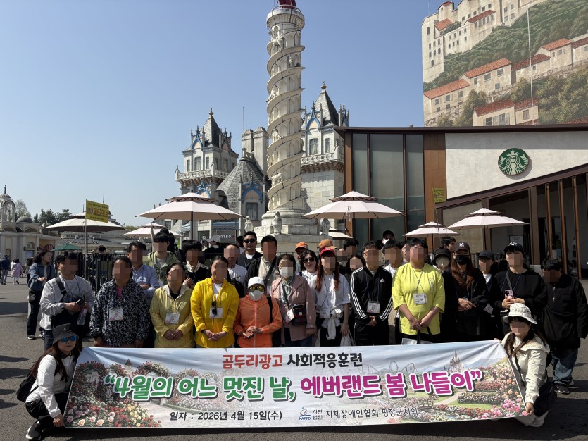 2026 근로장애인 사회적응훈련(2026.04.15. " 4월의 어느 멋진 날, 에버랜드 봄나들이") 페이지 정보 작성자관리자 댓글 0건 조회 7회 작성일 26-04-22 15:31 본문 SNS 공유 목록 이전글2026 4월 산업안전보건교육(2026.04.22.) 26.04.22 다음글2026 장애인근로자 사회적응훈련(에버랜드 봄나들이) 사전 종사자 활동지원 교육(2026.04.13.) 26.04.22 댓글목록 댓글목록 등록된 댓글이 없습니다.